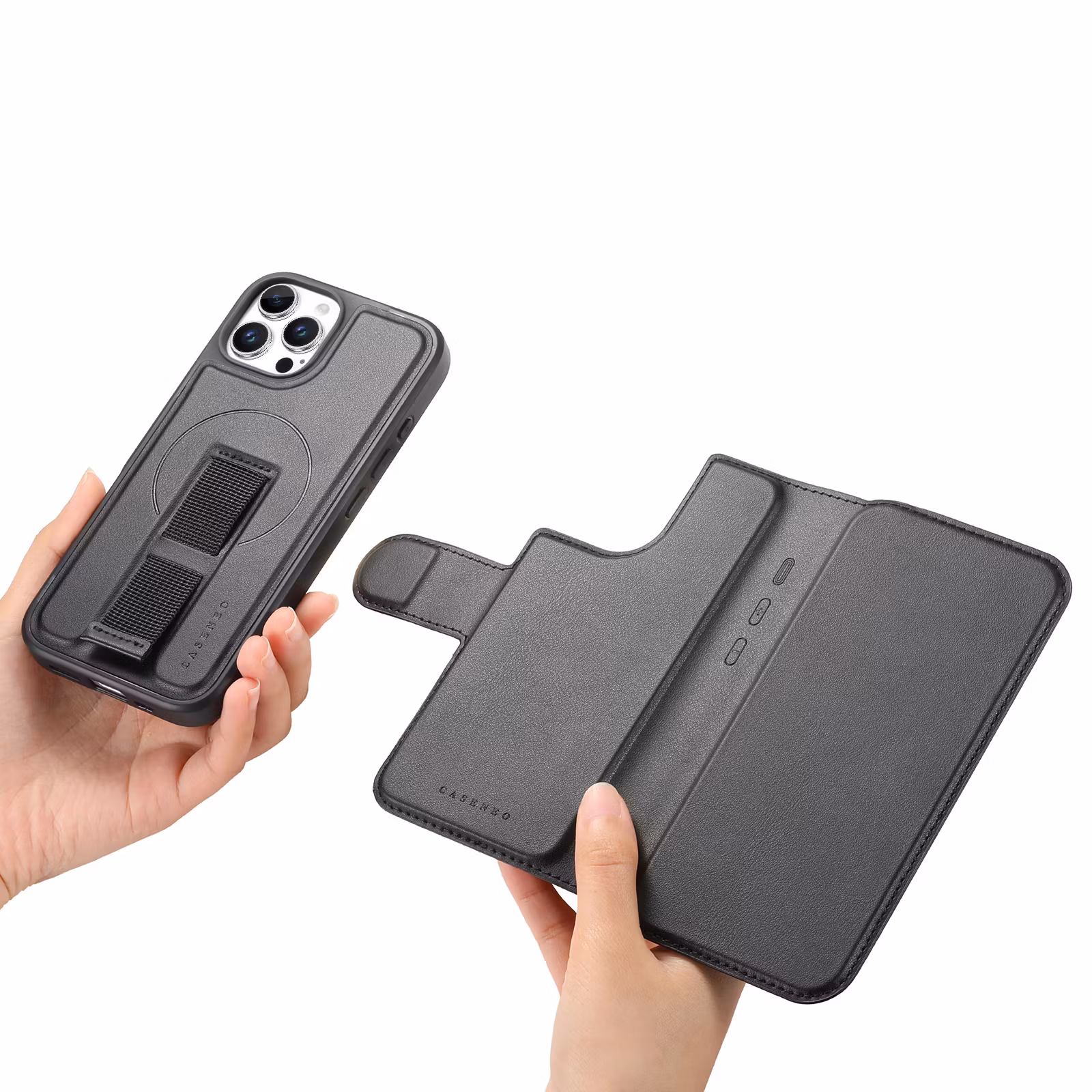 Med denna svarta iPhone 13 Pro plånbok med MagSafe-skal och fingerband får du en komplett lösning för både skydd och funktionalitet – samtidigt som din mobil behåller en modern och stilren look.